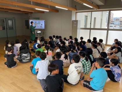 2時間目には、体育館でお話を聞き、いろんな国の文化について知りました。