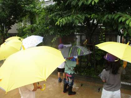 雨の日は晴れの日と違うのかな?と疑問をもちながら、においや音を感じたり、水の粒を触ってみたりしました。