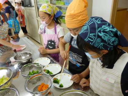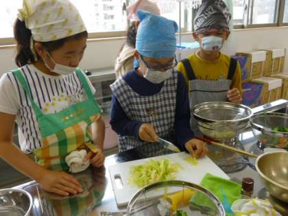 「ゆでる調理をしよう」ということで,人参・ブロッコリー・キャベツを一口大の大きさに包丁で切り,お鍋でゆでて調理しました。