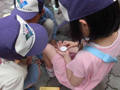 まちの様子を知るために,5月10日,1回目のまちたんけんをしました。3年生全員で,校区の西の方を歩き,いろいろな施設やお店,建物,工場などを見つけ,今までよりまちの様子が分かったようです。公園では,方位磁針を使って,方角を確認しました。