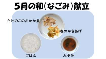 春においしい新たまねぎ・新じゃがいも・しらすぼしを使った「春のかきあげ」,旬のたけのこを使った「たけのこのおかか煮」,京北みそを使った「みそ汁」でした。
