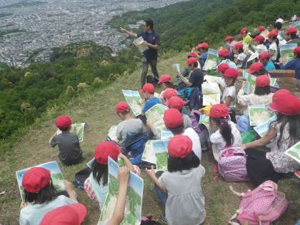16日(火)に,社会見学で大文字山に登り,京都市を一望しました。地図と見比べ,京都市のまちの様子を確かめました。