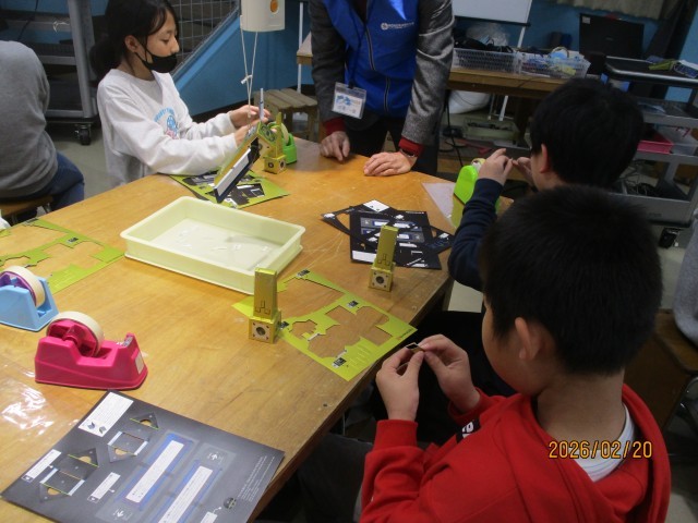 展示では、京都の企業や職人さんたちの工夫や努力、ものを作り出す想いを知ることができ、子どもたちは興味津々の様子でした。体験学習では,ひかりの仕組みを知ることのできる道具を制作しました。自分で作った道具を用いて3種の光の違いを実感することができました。