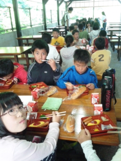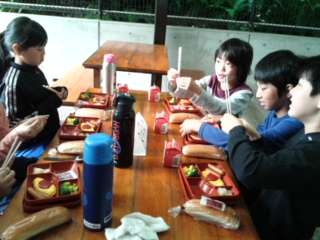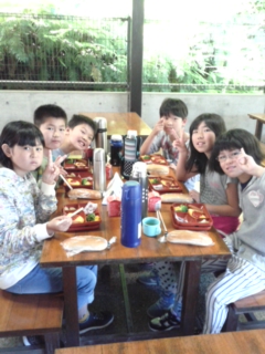 朝食です。さわやかな外で食べると,よりおいしく感じられます。
