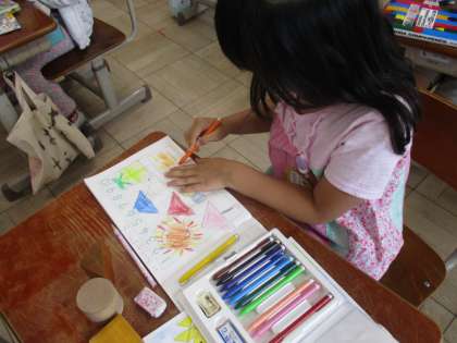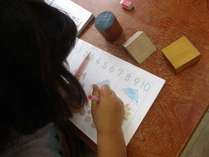 しかくやさんかく,まるの形の積み木を使って,絵をかきました。