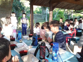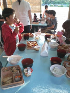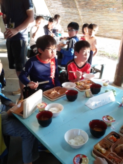 やっと夕御飯。お腹もペコペコ。食事後は,日暮れを待って、お待ちかねのキャンプファイヤーです。