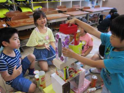 色々な大きさの箱がありました。つむ・組み立てる・並べる・・・みんなで相談しています!!