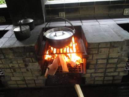 ハヤシライスの準備ができたら、ハヤシライスの鍋もかまどに置きます。