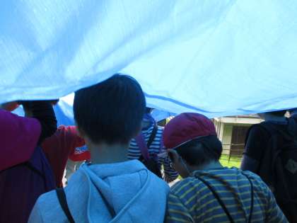 待っている間、山の家の所員の方にゲームをしてもらいました。雨が弱くなったのを見計らって、ブルーシートアンブレラで帰りました。