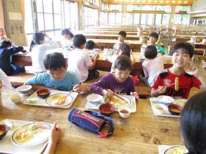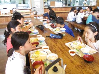 みんな、もりもりおいしくいただいています。野外炊事の昼食のハヤシライスをおなかいっぱい食べたので、少な目になっている子がいます。