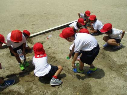 今日の生活の学習では,夏の自然と触れ合い,水・砂・土などを利用して遊びました。