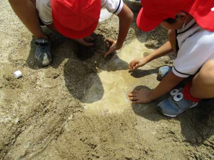 空き容器に水を入れて,砂場に流すことで川を作ったり,水をかけあったりすることで,水のよさを体感しました。