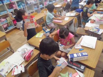 図工の授業でゴムの力を利用して動くおもちゃづくりをしました。これから、設計図を書き改良していく中で、どのような作品ができるかとても楽しみです。
