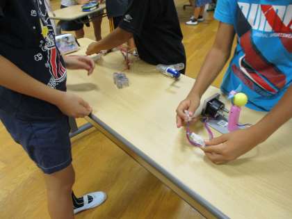 今日は日新電機から講師の方に来ていただき,自然エネルギーを生かした発電について学習しました。ソーラーカーに乗車してその発電力を体感したり,手回し発電機を使い,扇風機を回したりしました。