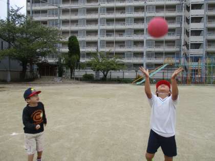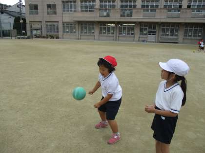 「ボールとなかよく」なるために,今日はいろいろな方法でボールを一人で投げて受けることをしました。その後,ペアでボールを投げたり受けたりする練習もしました。相手が受け取りやすい投げ方の工夫を見つける子もいました。
