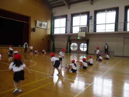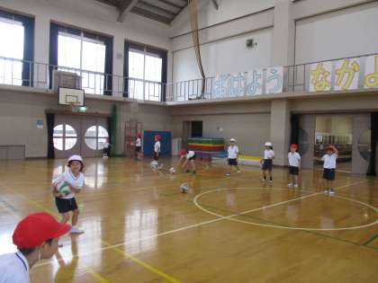 今日は2回目の「ボールあそび」でした。今日は「ころがす」練習をしてボールと仲良くなりました。短い距離は簡単でも,長い距離で相手にパスをするのは難しかったようです。その中でも,転がし方を工夫する姿も見られました。