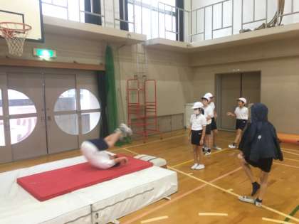 体育科ではマット運動をしています。今日は「ねらい2」の活動で新しい技の習得を目指し,取り組みました。動画で技のポイントを確認したり,工夫された場で練習したり,それぞれがめあてをもって頑張っていました。