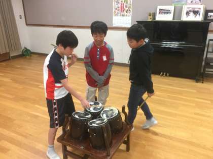 今日は学習発表会に向けて,地域の伝統芸能である中堂寺六斎念仏の練習をしました。部活動や地域の団体で普段から練習をやっている人が多いので,その人たちが先生となり教えてくれました。子どもたち同士で教え合う姿は良いですね。