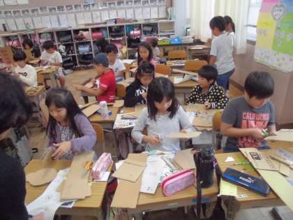図工の時間に段ボールを使って作品を作っています。前回の授業で計画図を書いたので、作業に取り掛かりました。