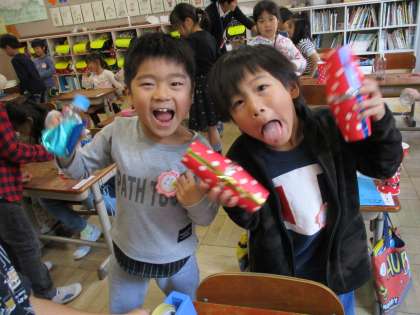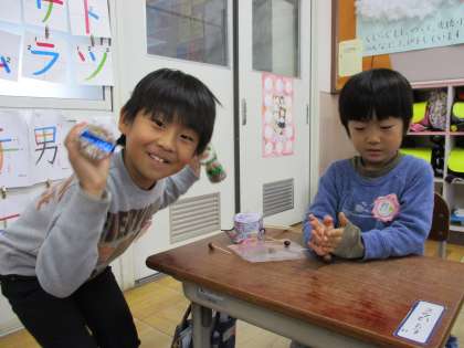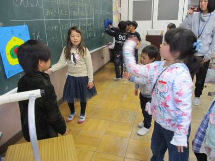 今日は,先週頑張って作ったあきのおもちゃで遊びました!「このけん玉は,入れやすいね!」「まと当てで100点が2回も出た!」など,楽しい発見満載の1時間でした!