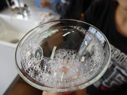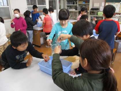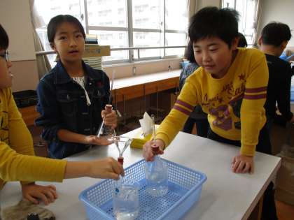 今日は石鹸水をガラス管の口に付け,なぜ温めたときに石鹸水の膜が膨れ,冷やしたときに石鹸水の膜が凹むのか,その理由を考えました。「空気の体積が膨らんでいるからだと思う。」など考えが出ていました。