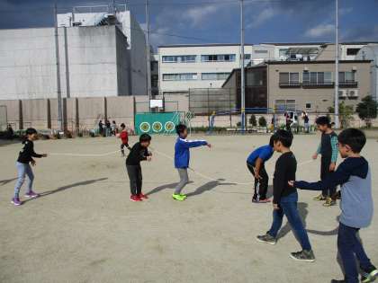 今日は昨日の雨とはうって変わって快晴でした。お昼休み子どもたちに誘われ,外に出てみるとみんな元気よく遊んでいました。今日から大縄で遊びだしたグループがありました。ワイワイ楽しそうでした。はたして大縄ブームは来るのでしょうか!?
