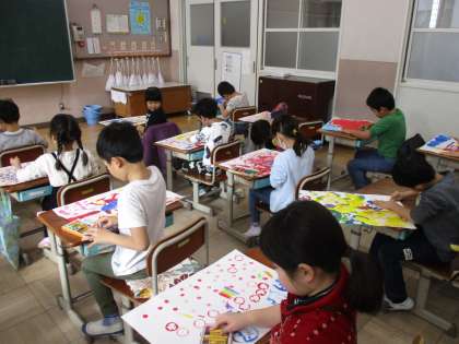 前の時間に絵の具でいろいろなかたちをうつしたものに,クレパスやコンテを使って絵をかきたしました。