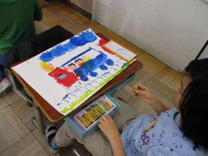 列車に乗っている場面や,シャボン玉の世界など,楽しい絵を表していました。