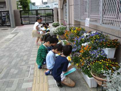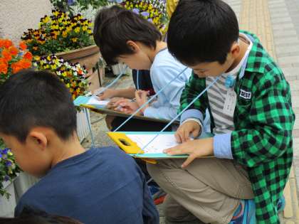 理科の学習で身近な植物や動物を観察しています。生きものの色や形,大きさの特徴をとらえて記録カードに書きました。