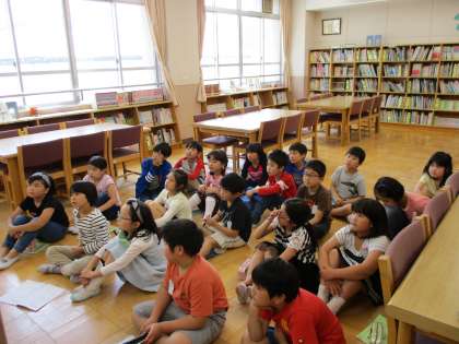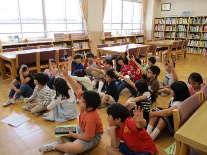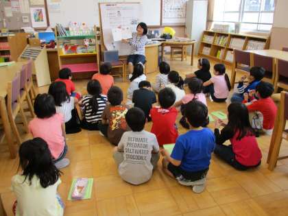 図書館オリエンテーションを行いました。読み聞かせをしてもらったり、本を実際に探してみたりしました。