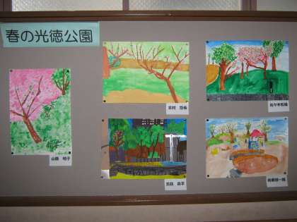 6月3日 6年生の図画の作品です。春の光徳公園の様子を絵に描きました。満開の桜の花や若草などをよく見て描きました。