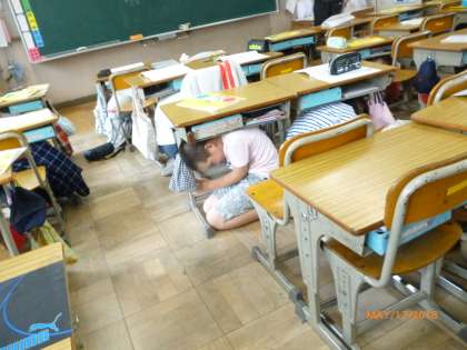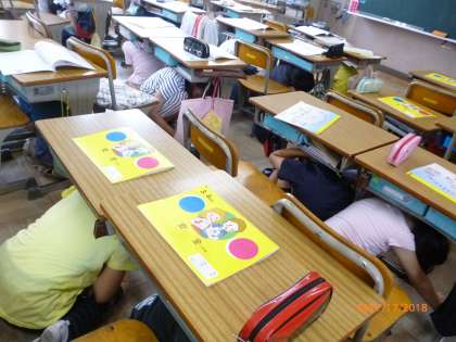 今日は、避難訓練の練習をしてから、集団下校をしました。震度5弱の地震が京都を襲ったという設定で、みんな一斉に机の下にかくれました。しっかりと頭を守って、しばらくじっとして放送を待ちました。4年生はとても静かに落ち着いて避難できました。