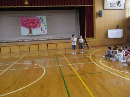 今日は1年生迎える会がありました。5年生となり,計画委員会の人は司会進行の仕事を任されていました。一人一人が一生懸命折った折り紙も無事に渡すことができました。