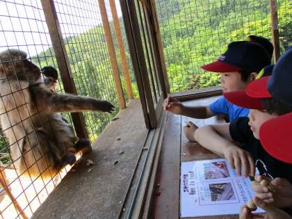 サルに落花生をあげました。サルと近づいて喜んだり驚いたりしています。