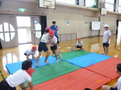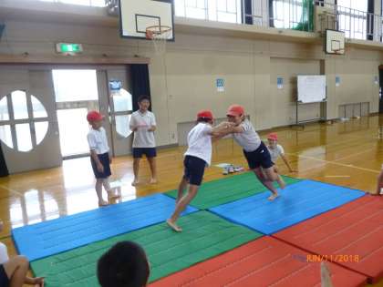 今日の体育は外があいにくの雨で鉄棒ができませんでした。そこで、体育館ですもう遊びをしました。ルールを確認しながら、けがのないように気を付けて取り組みました。