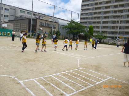 車道に見立てた運動場を走行するため、お手本を見せてもらいました。また、走るコースを歩いて確かめました。