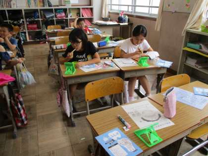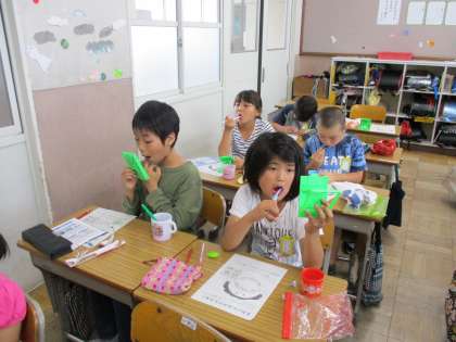 今週は歯磨週間です。今日は、みんなの歯みがきの仕方をふりかえり、どこに汚れが残りやすいかを調べました。赤く染まった部分が、磨き残しのあった部分です。鏡でじっくりと観察してから、歯磨きをしました。これからの歯磨きに生かしていってほしいです。