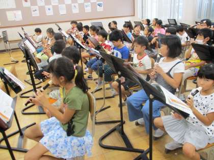今日は学年で合同の音楽です。「ゆかいなもっきん」をみんなで演奏しました。