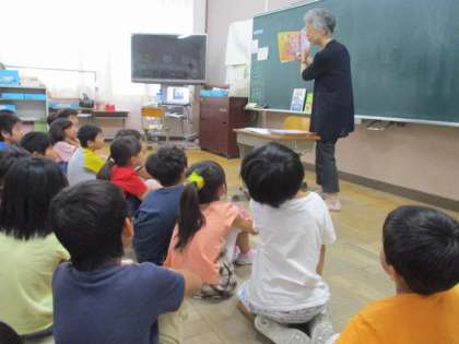 京都新聞の読書アドバイザーに来ていただき,「お話を絵にするコンクール」で描く本の紹介をしていただきました。今日紹介していただいた本の中から,絵の具をつかってお話の絵を描きます。来週からの図工の学習をたのしみにしている様子でした。