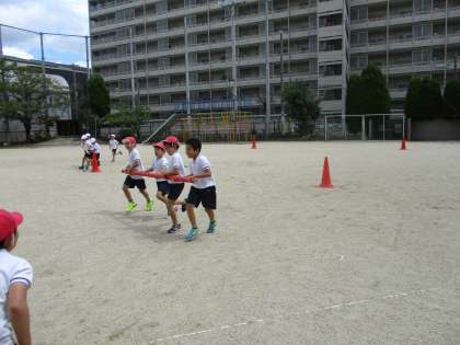 今日は団体競技の「台風の目」の練習をしました。初めて棒を使って、走ったり跳んだりしました。頑張れという応援の声がたくさん聞こえてきました。