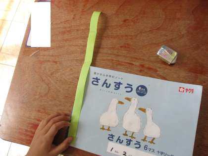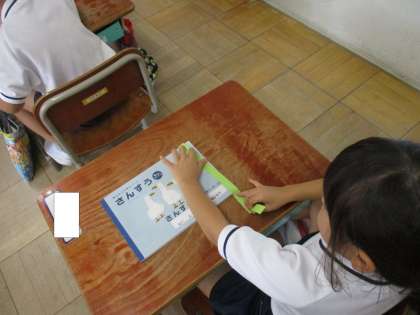 算数科の「おおきさくらべ」の学習で,色々な物の長さを比べました。はしをそろえたり,ぴんと伸ばしたり,テープを使ったりすれば上手に比べられることに気付きました。