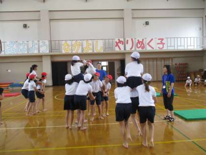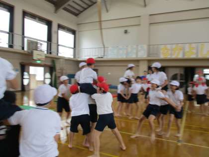 運動会の騎馬戦の練習に取り組んでいます。「どうしたら勝てるかな?」と子どもたちに投げかけると,「挟み撃ちをしたら?」「外から回り込んだら?」と作戦を考え出しました。そういった作戦を試合を生かせるようがんばっています。