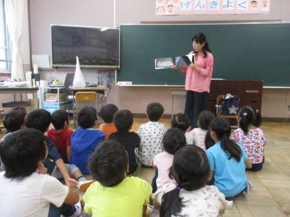 わぁのなかまによる読み聞かせがありました。へびが色々なものを飲み込んでいくお話です。子どもたちは「りんごかな?」「今度はライオン!」と,何を飲み込んだか予想しながら聞いていました。とても楽しい時間でした。
