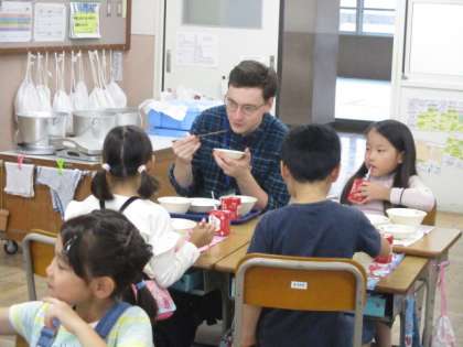 今日はALTのジェイミー先生と一緒に給食を食べました。