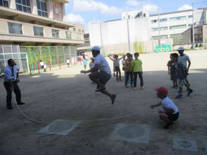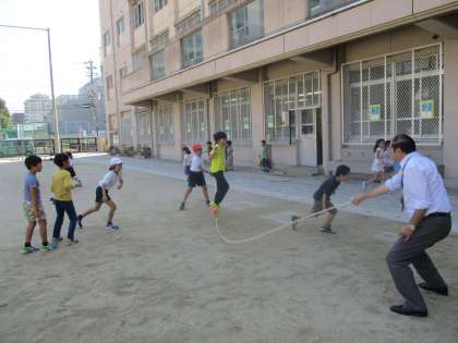 中間休み。ふと外を見てみると,3年生の大縄の中に5年生が混ぜてもらう形で一緒に遊んでいました。5年生が回す役にも回っていて学年を越えて楽しく遊ぶ姿が微笑ましかったです。