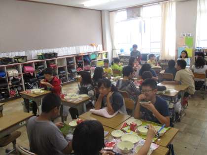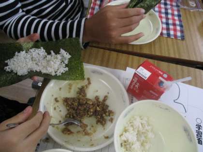 今日の給食は1年に1度しか出ない肉みそ納豆の日でした。子どもたちは手巻き寿司にして肉みそ納豆を食べていました。納豆の風味が苦手な人もいましたが,多くの人はおいしそうに食べていました。