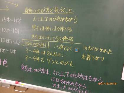 保健の学習では、自分たちの体がどのように成長しているのかを学びました。一人一人の身長の伸び方をグラフにして確認し、それぞれ個性があることも分かりました。早くに背が伸びる子もいれば、ゆっくりと伸びていく子もいます。十人十色ということですね。