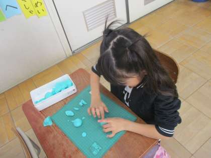 図画工作の学習で,粘土で色々なごちそうを作りました。ステーキやお寿司,パフェなど,おいしそうな食べ物がたくさんできました。