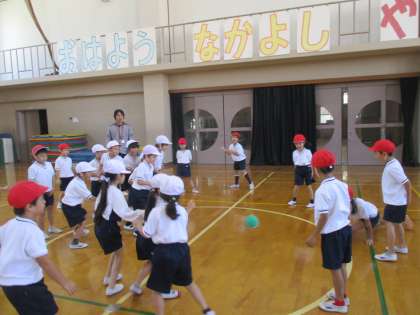 体育の学習では,ころがしドッジボールに取り組んでいます。だんだん上手にボールを転がせるようになってきました。