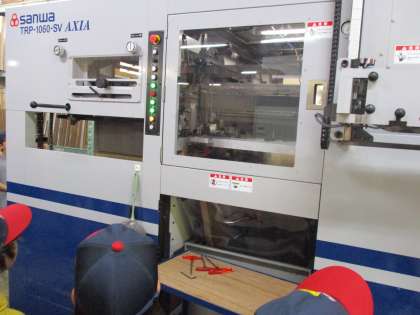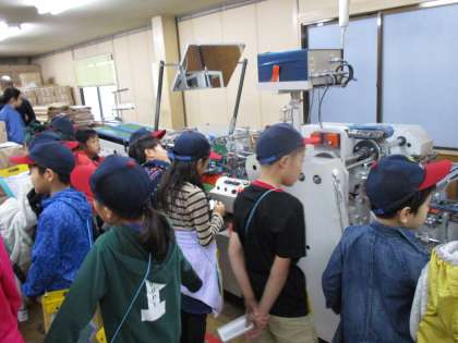 印刷する機械,裁断する機械,箱にする機械に子どもたちは興味津々でした。